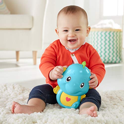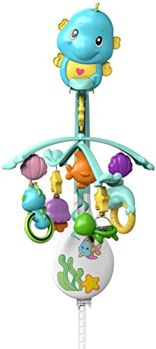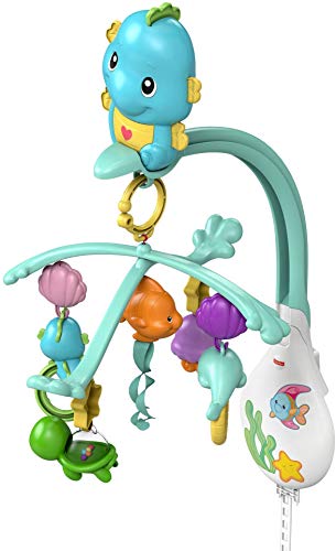 Fisher Price 3-in-1 Soothe and Play Seahorse Mobile has 3 modes of use. It includes 4 hanging toys become rattles for baby and 15 minutes of music.