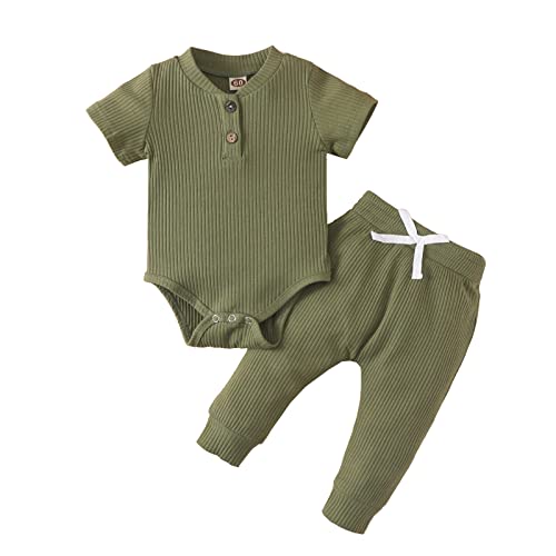 Newborn Baby Girl Boy Clothes Ribbed Knitted Cotton Short Sleeve Romper Unisex Outfit Pants Set